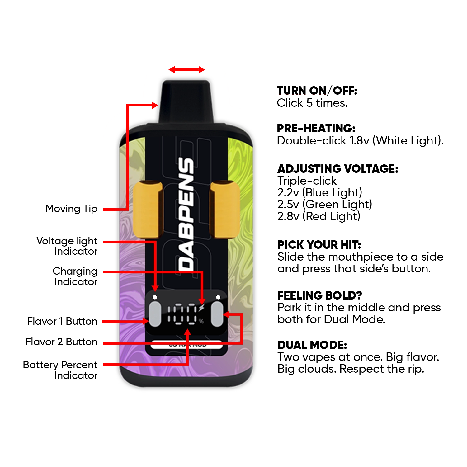 Designed for consistency, this rechargeable distillate vape includes adjustable voltage and dual-flavor modes, giving users control over vapor intensity. Its long-lasting 6g capacity and smooth airflow make it a reliable option for flavor-focused users.