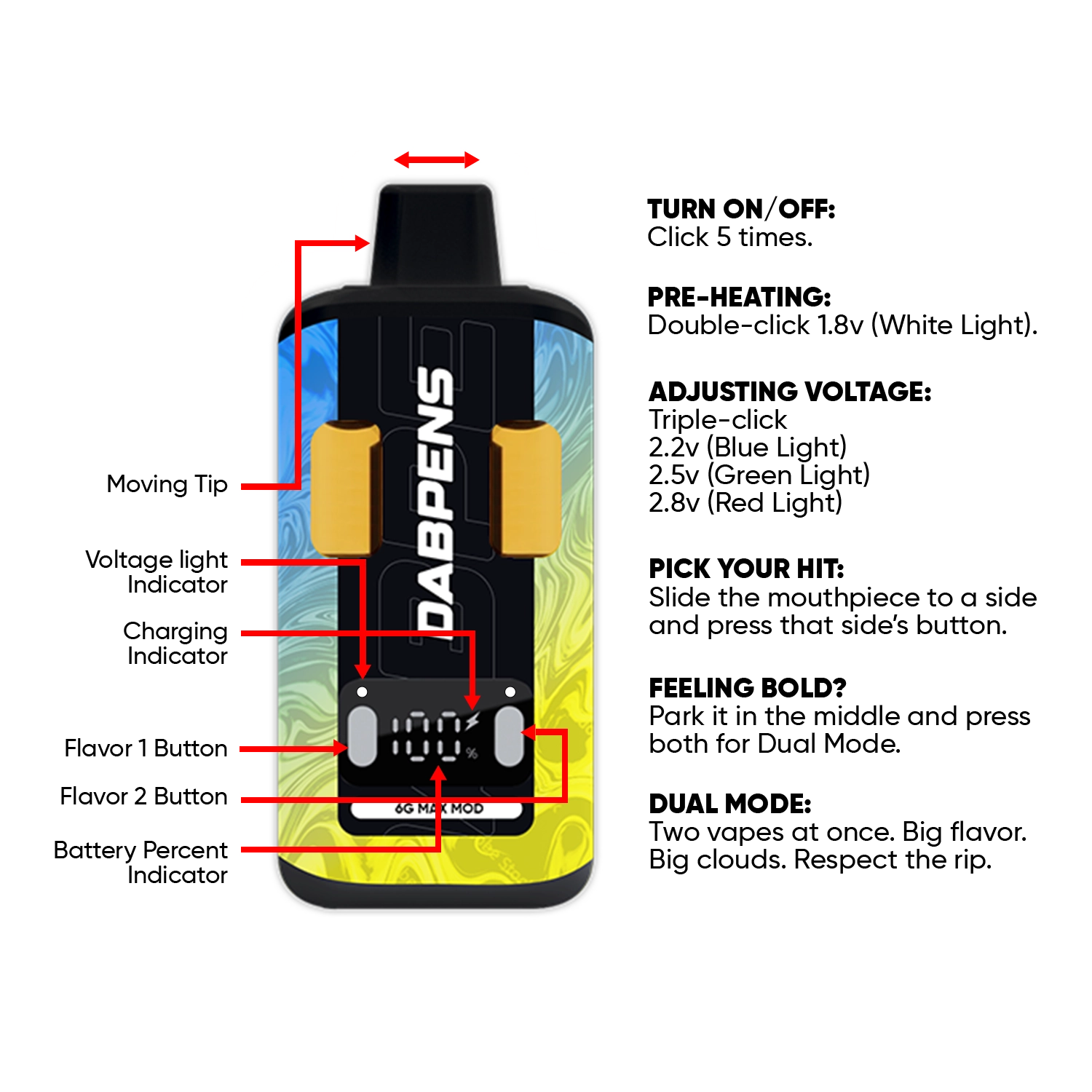 This rechargeable THC distillate vape features adjustable voltage settings and dual-flavor functionality, allowing users to tailor their experience. Built for longevity and performance, it provides reliable flavor and vapor throughout the full 6g capacity.